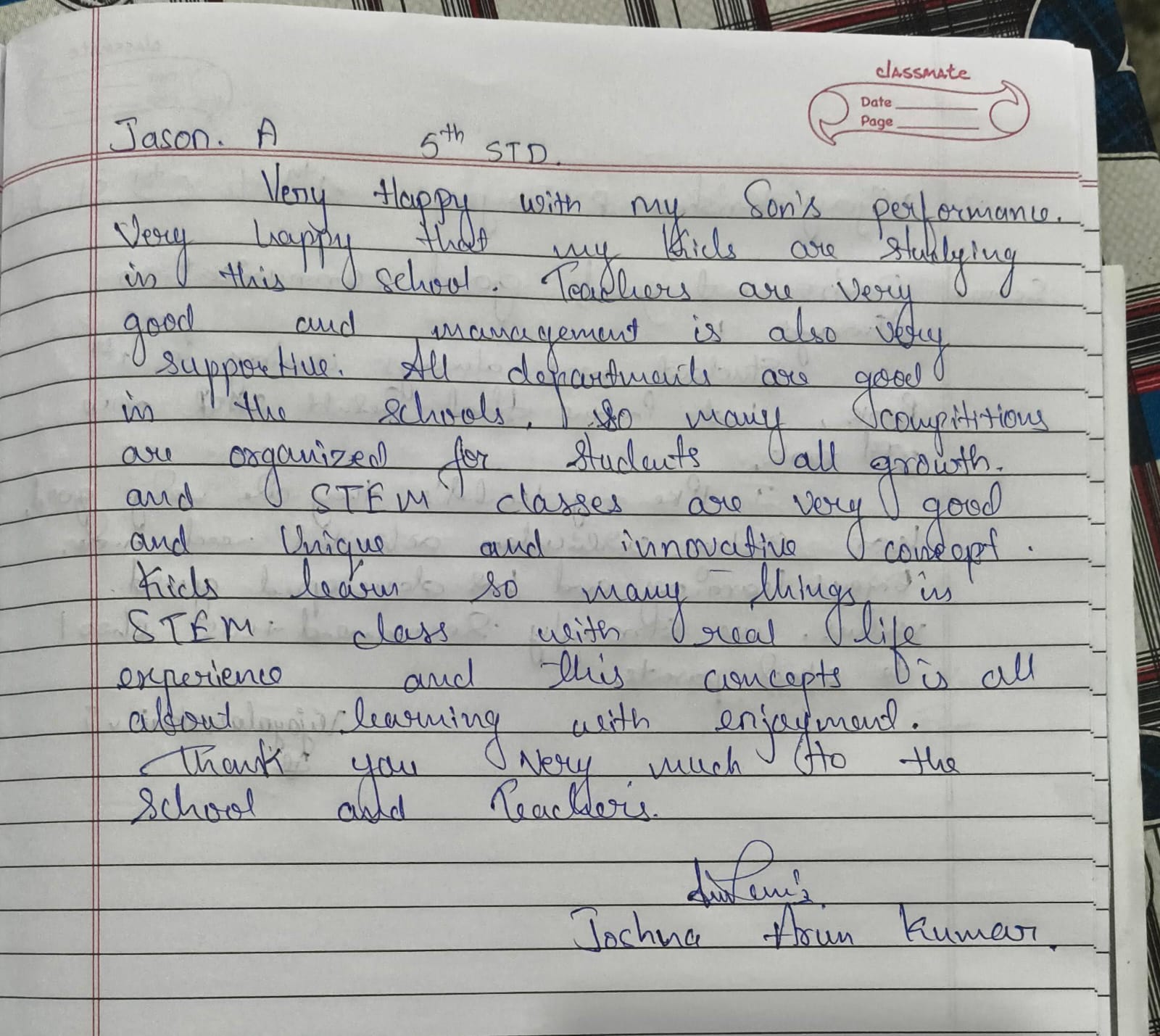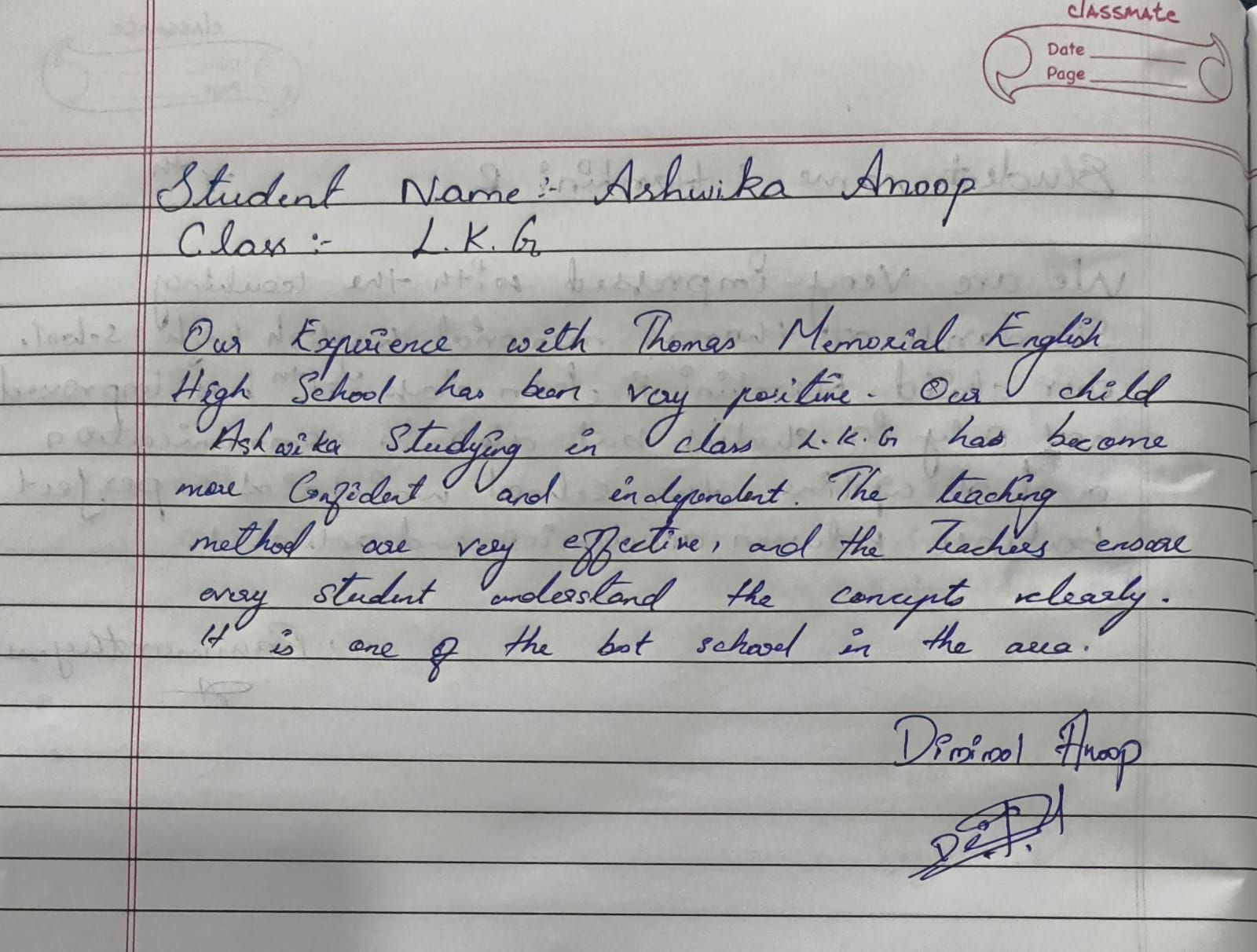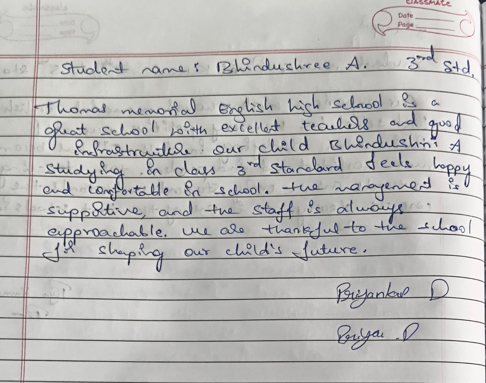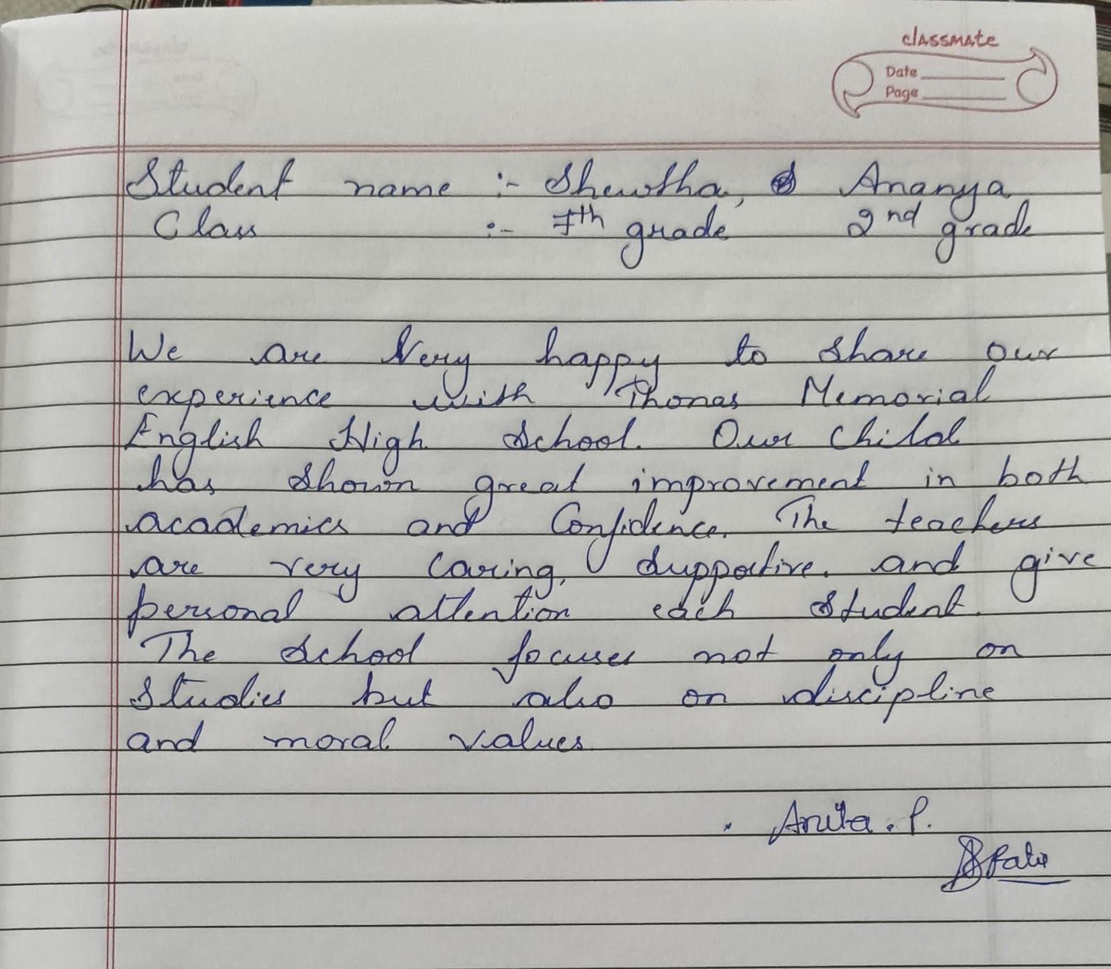 At Thomas Memorial English High School (TMEHS), the trust and satisfaction of parents mean everything to us. This page showcases genuine handwritten reviews shared by parents, expressing their experiences, appreciation, and confidence in our school.